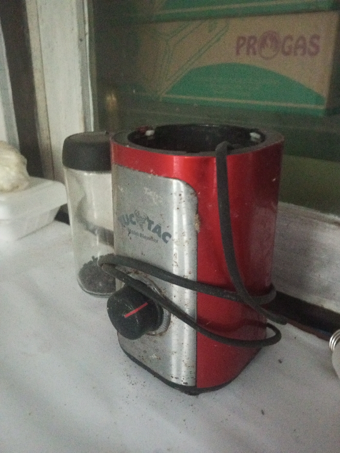 The scene, located in Ciherang, Indonesia, displays a still life arrangement on a white, speckled surface. Dominating the center is a red and silver "TUC TAC Mini Blender" base. The blender features a silver-toned front panel inscribed with "TUC TAC Mini Blender," flanked by vertical red panels. A black control knob with a red indicator mark is affixed to the lower front. A black electrical cord is loosely wrapped around the lower section of the appliance. To the left of the blender, a transparent cylindrical spice grinder with a black cap holds dark, granular material. A portion of a white styrofoam container is partially visible further to the left. The background features a greenish vertical surface, against which a light brown cardboard box displaying the word "PROGAS" and a green semicircular emblem is present. The white surface supporting the objects shows scattered dark particulate matter. No individuals are visible, and no active interactions are depicted.