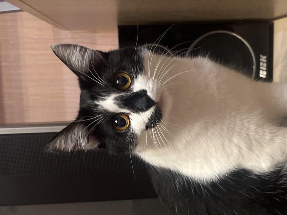 The image displays a domestic cat, identified as residing in the city of Baranavichy, Belarus. The cat exhibits a black and white bicolored coat, commonly referred to as a tuxedo pattern, with white fur covering the chest, paws, and muzzle area, contrasting with black fur on the ears, head, back, and tail. Its face features distinctive large, round, amber-colored eyes with slightly dilated pupils. A prominent black patch covers the cat's nose and extends down to its upper lip. The animal is positioned centrally, facing directly towards the viewer with an alert and focused expression. The background consists of indoor elements: to the left, a dark, vertically oriented speaker or electronic device is partially visible. To the lower right, another dark audio component is present, displaying a silver circular element and the partial brand name "BBK." A light brown or beige surface, possibly furniture or a wall, occupies the upper right portion of the background. No human subjects are present in the frame.