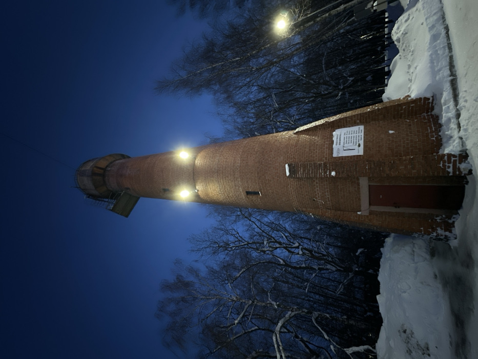 An outdoor, low-angle shot of a tall, cylindrical brick tower against a twilight sky. Lit by external lights, the tower's texture is highlighted. A door and informational signage are visible near its base, which is surrounded by snow. Bare trees frame the scene, adding to the stark, wintry aesthetic.