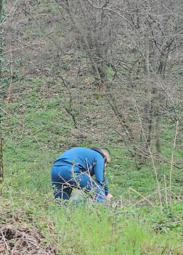 A man in a blue tracksuit with yellow stripes stands in a grassy wooded area, briefly looking up towards the camera before returning to a stooping position in the grass. The area appears to be the side of a hill, with trees and dense vegetation. The sky is overcast.