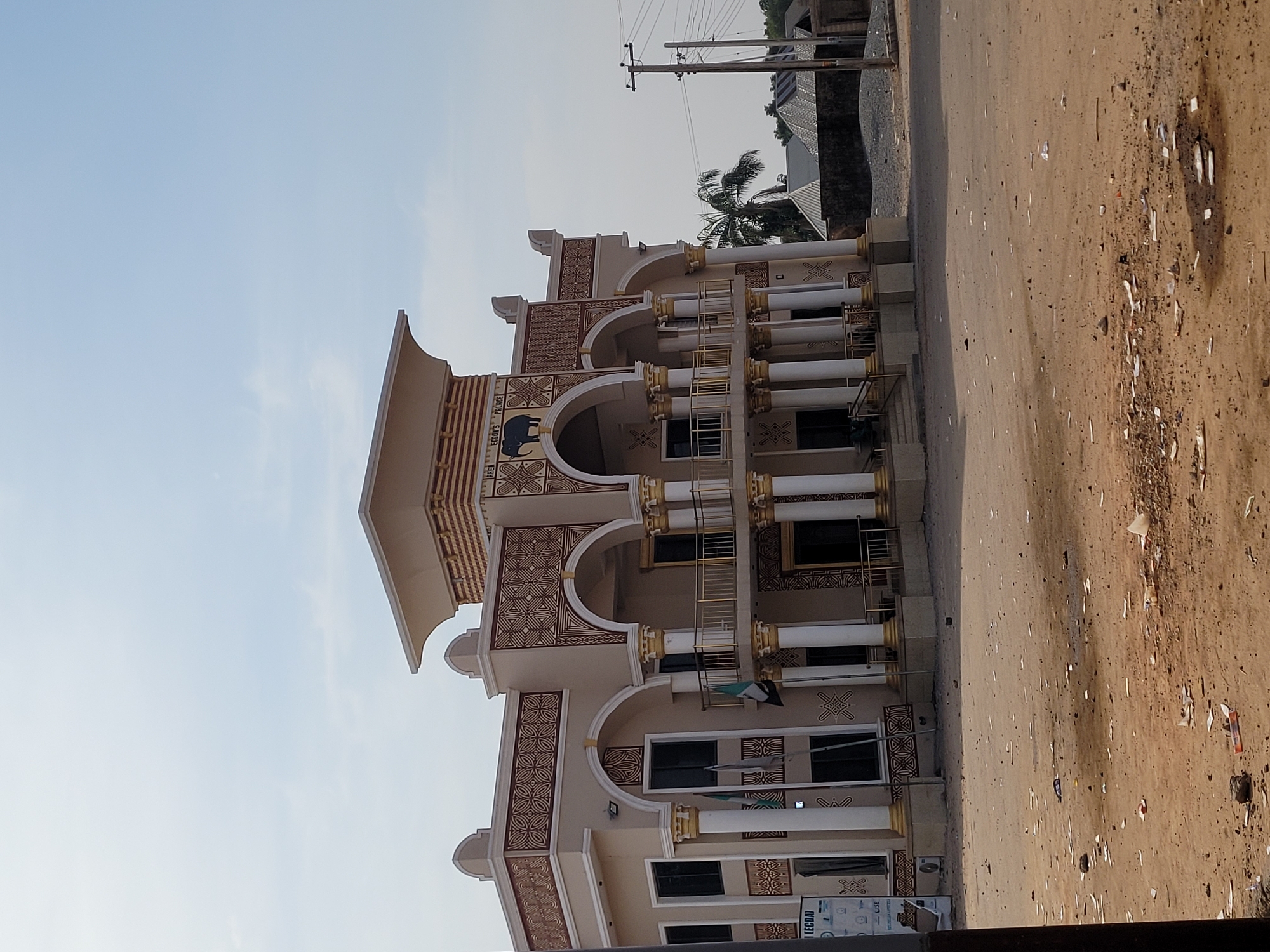 The image depicts a two-story traditional palace building, identified by signage as "AREN EGON'S PALACE," located in Nassarawa Egon, Nigeria. The structure is characterized by a cream-colored facade with extensive brown and gold geometric patterns and trim. It features a central entrance with a set of steps leading to a raised ground floor and a first-floor balcony. The entrance and balcony are supported by multiple white columns with gold capitals and bases, framed by ornate arches. Above the central arch on the first floor, a dark silhouette of an elephant is depicted. Two flags, one appearing to be the Nigerian national flag, are mounted on poles near the left side of the main entrance. Dark-paned windows are visible on both levels. The foreground consists of an unpaved, reddish-brown dirt area, heavily littered with various pieces of paper, plastic, and small debris. No individuals or vehicles are present in the immediate foreground. To the right of the palace, in the background, utility poles with power lines are visible, along with a prominent palm tree. Further back, residential structures with corrugated metal roofs are discernible behind a low wall, indicating a populated area. The sky above is clear and light blue, suggesting daylight conditions.