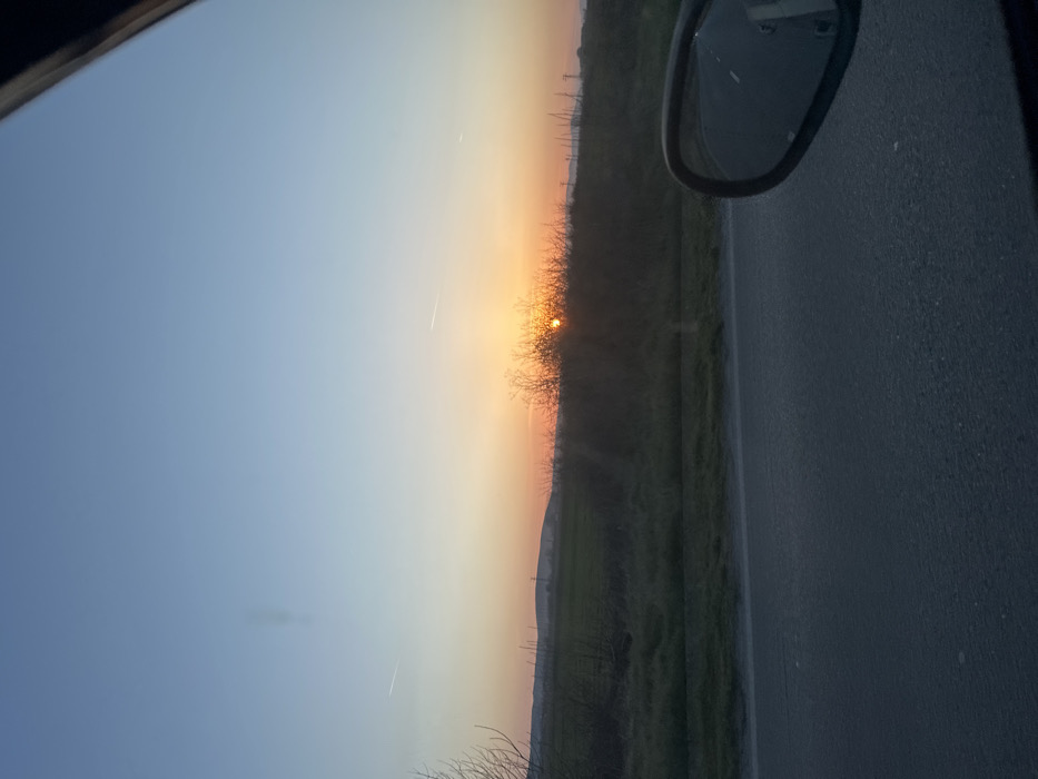 The image depicts an outdoor scene in the city of Krushare, Bulgaria, observed from inside a vehicle during either sunrise or sunset. The sky transitions from light blue overhead to vibrant orange and yellow at the horizon. Two faint contrails are visible in the upper sky. The sun, a bright orange disc, is partially obscured by a dense cluster of leafless, thorny bushes located in the mid-ground, slightly to the right of the center. To the left, a dark green field extends towards distant, undulating hills. Sparse, bare tree branches are present on the far left. A dark asphalt road occupies the immediate foreground. In the lower right quadrant, a dark, oval-shaped vehicle side-view mirror reflects a segment of the road behind the observer. A dark vehicle pillar or frame obscures the upper right corner of the image. No individuals are depicted.