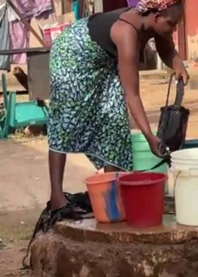 A woman in a headscarf, black tank top, and a knee-length green and white patterned skirt stands by a well. She appears to be drawing water using a rope attached to a bucket. There are several buckets of different colors on top of the well. She is standing on a concrete structure and there is dirt on the ground around it. Behind her are some buildings, some laundry hanging on a line, and some scattered furniture.