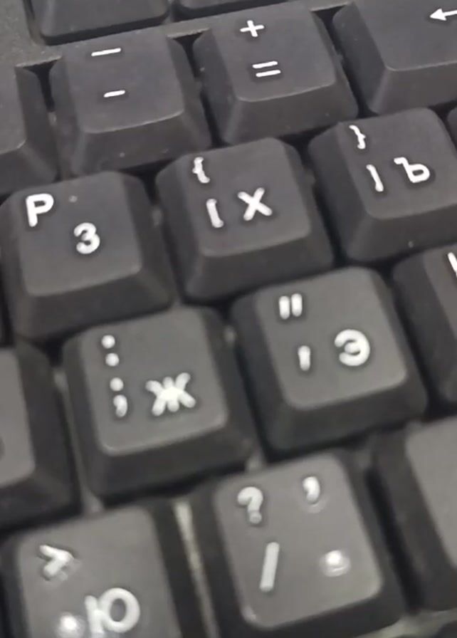 close-up view of a black computer keyboard. The focus is on the keys with letters in Cyrillic alphabet alongside Latin letters and symbols. The video zooms in slightly, emphasizing the detail on the keys. The keyboard appears to be dusty.