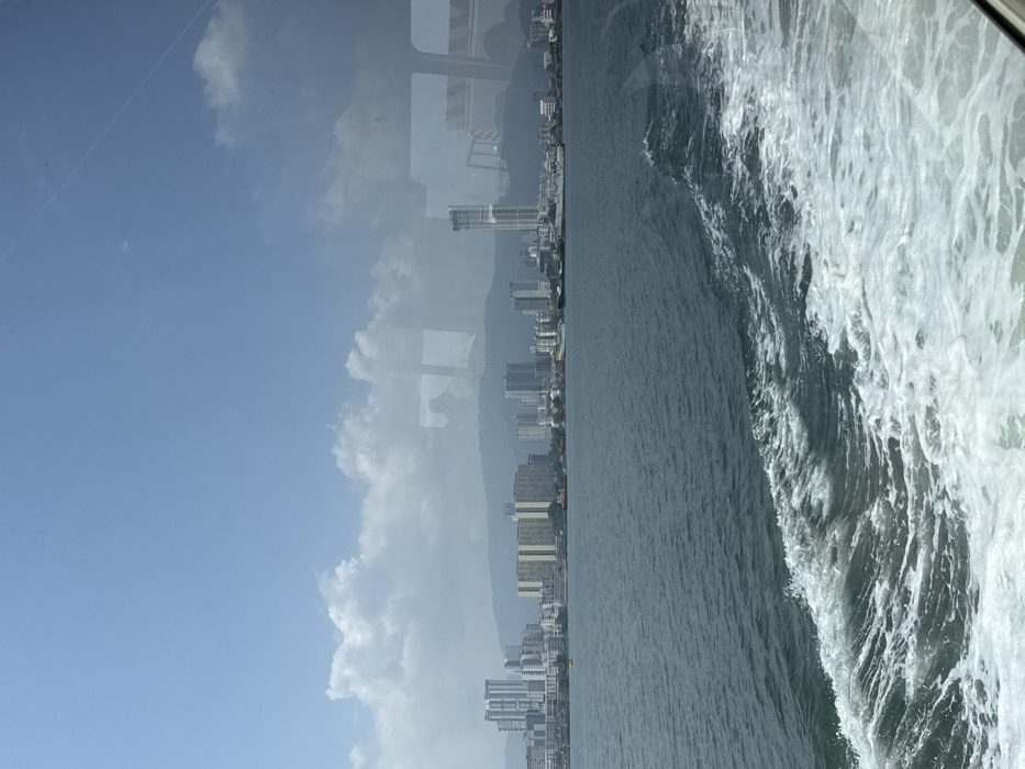 From a vessel, the cityscape stretches along the coast under a cloudy blue sky