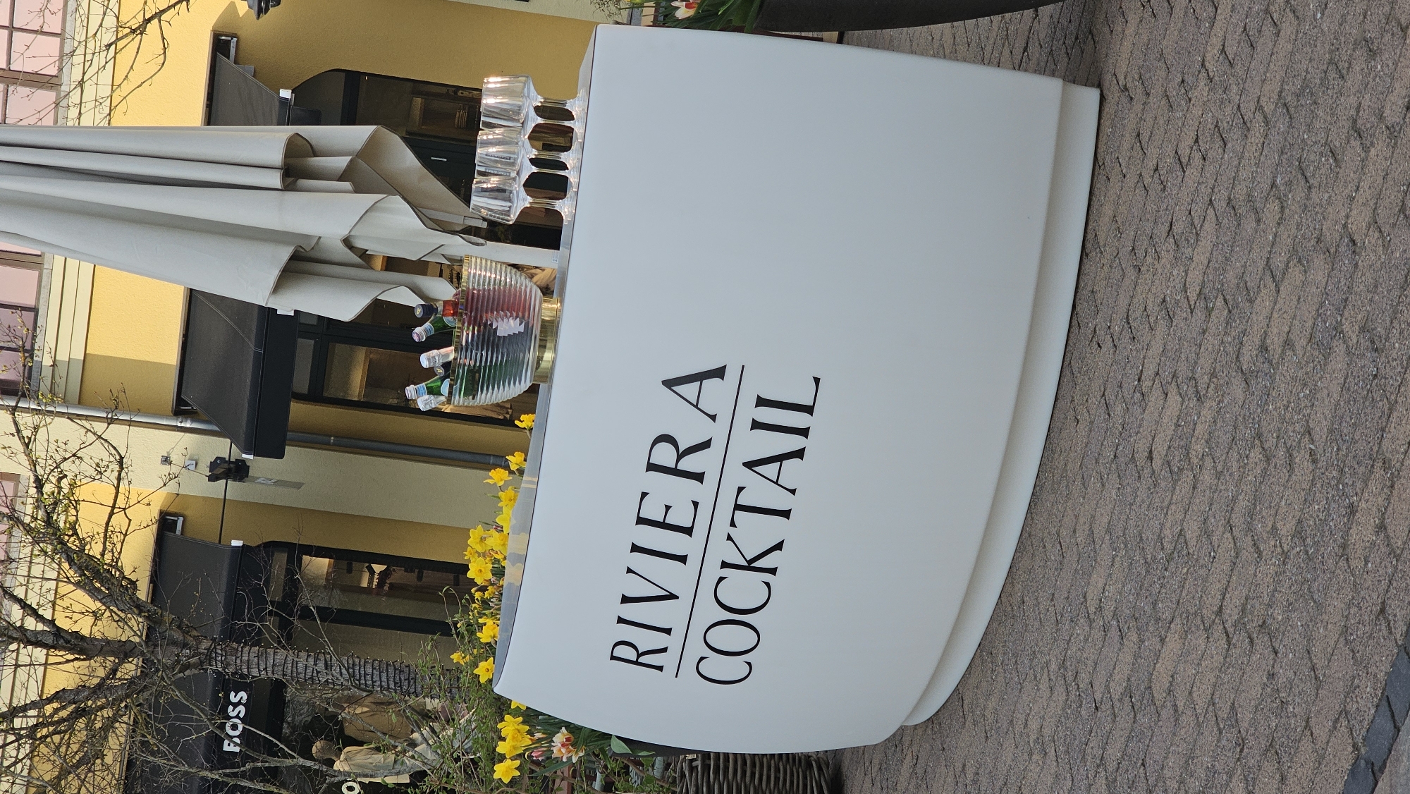 The scene is set in an outdoor shopping area, specifically Wertheim Village in Wertheim, Germany. A white, curved portable bar counter is positioned centrally on a paved surface composed of grey and brown interlocking pavers arranged in a herringbone pattern. The counter features the black text "RIVIERA" underlined, with "COCKTAIL" printed below it. On the counter's surface, a clear, ribbed ice bucket with a gold-colored base contains several bottles of various colors, including green and reddish, suggesting chilled beverages. To the right of the ice bucket, four empty champagne flutes are aligned. Behind the counter, a planter filled with vibrant yellow daffodils is visible. A large, beige outdoor umbrella stands collapsed and folded to the right side of the setup. In the background, light yellow-colored buildings with multiple storefronts are present. Each storefront is covered by a deployed black retractable awning. A partial sign displaying "BOSS" is visible over one storefront to the left. Interior lighting from the shops illuminates mannequins dressed in light clothing, visible through the glass windows. Deciduous trees with nascent green foliage are interspersed among the buildings. The scene is illuminated by natural daylight. No individuals are visible.
