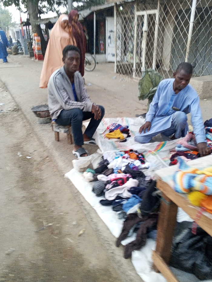 Two men sit near a street side clothing display. One wears a grey jacket and blue jeans, sitting on a wooden stool. The other man kneels, wearing a light blue shirt and blue jeans, organizing the clothes. Various garments, including hats, shirts, and socks, are spread on a white cloth. In the background, two women in traditional dresses walk past shops with barred windows. A dirt road stretches into the distance.