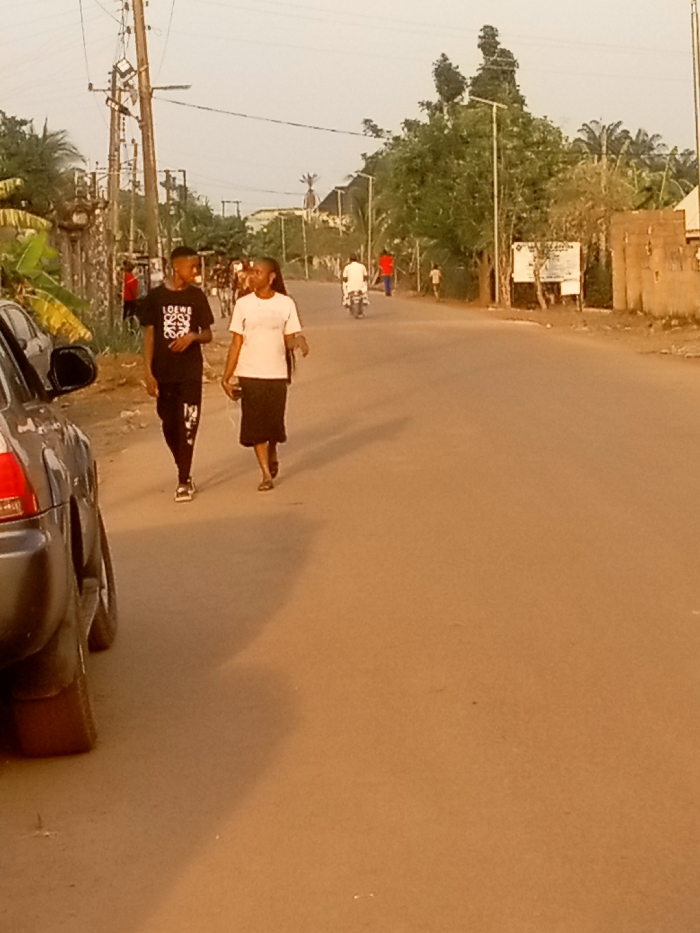 The image depicts a paved road scene in Igbenu, Nigeria, during what appears to be late afternoon or early evening, characterized by golden-hour lighting. In the foreground, center-left, a dark-colored sedan or SUV is partially visible, parked or stopped on the road's edge. Two individuals, a male and a female, walk side-by-side on the road, moving away from the camera. The male, on the left, wears a black t-shirt with a white "LOEWE" graphic and dark trousers; his head is turned towards the female. The female, on the right, wears a white t-shirt and a dark knee-length skirt, looking forward. Long shadows from these individuals are cast across the road to their left. Further down the road, a person on a motorcycle, dressed in white, travels away from the viewer. Other distant figures include a person in a red shirt and a smaller individual walking on the right side of the road, and additional indistinct figures on the left. The left side of the road features a concrete wall, lush green vegetation including banana plants, and multiple utility poles with overhead wires and transformers. The right side of the road showcases buildings with reddish-brown walls, various trees, and streetlights, some equipped with solar panels. A white signboard on the right shoulder is partially legible, indicating "IBENU SECONDARY SCHOOL". The sky above is light, and the overall environment suggests a semi-urban setting.