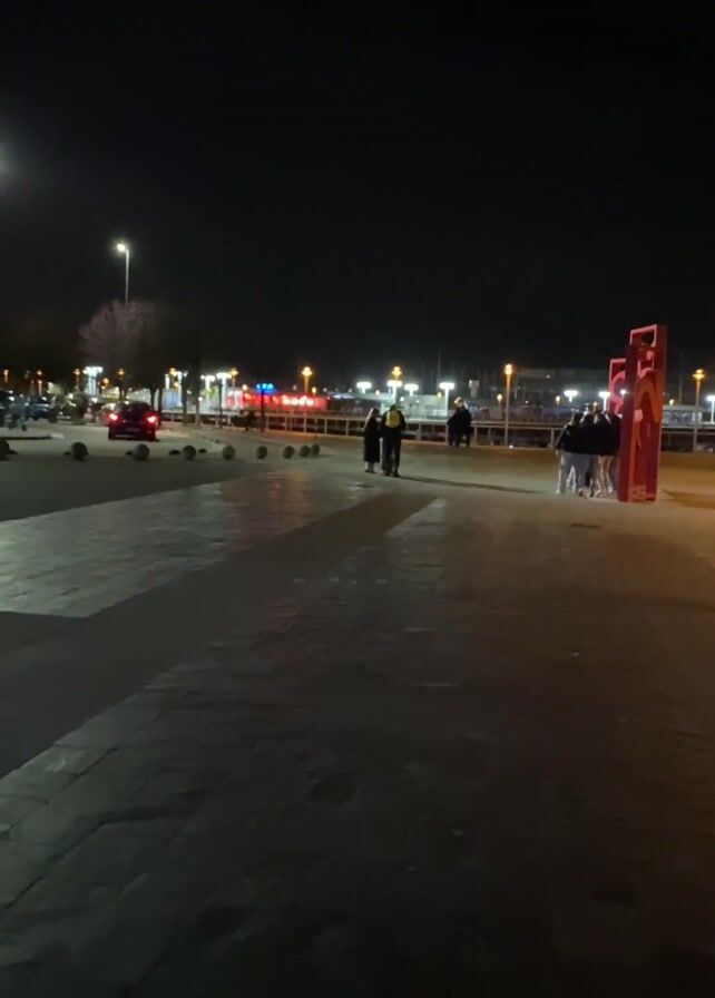 night scene on a paved area. There are groups of people standing around, and a couple walking. In the distance, there are lights, and there appears to be a body of water. There is also a red, upright structure or sculpture. The general atmosphere seems quiet.
