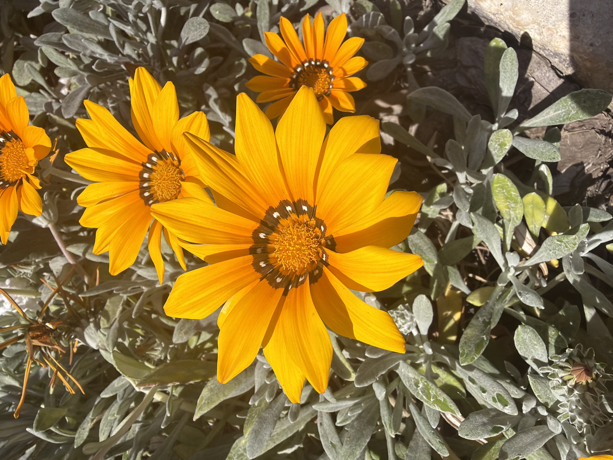 The image depicts a cluster of orange gazania flowers surrounded by silvery-green foliage, likely taken outdoors in daylight