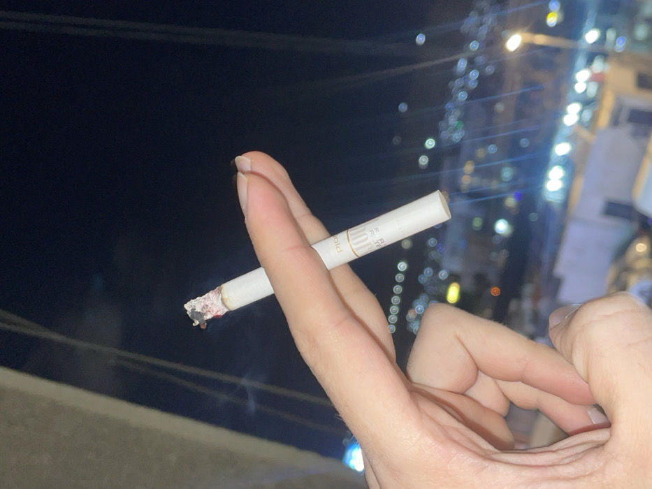 A hand holds a lit cigarette against a blurred background of city lights at night