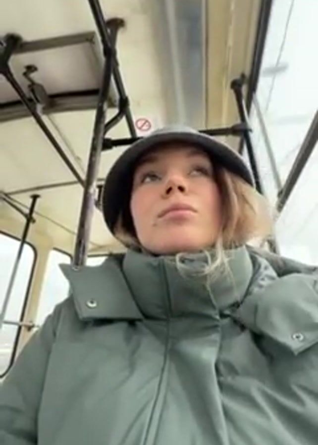 A woman with fair skin and light brown hair, wearing a grey bucket hat and a green puffer jacket, is riding in a tram. The tram has large windows offering a view of a snowy cityscape. The interior of the tram is white and utilitarian, with visible metal bars and fixtures. The woman looks around, seemingly observing her surroundings as the tram moves.