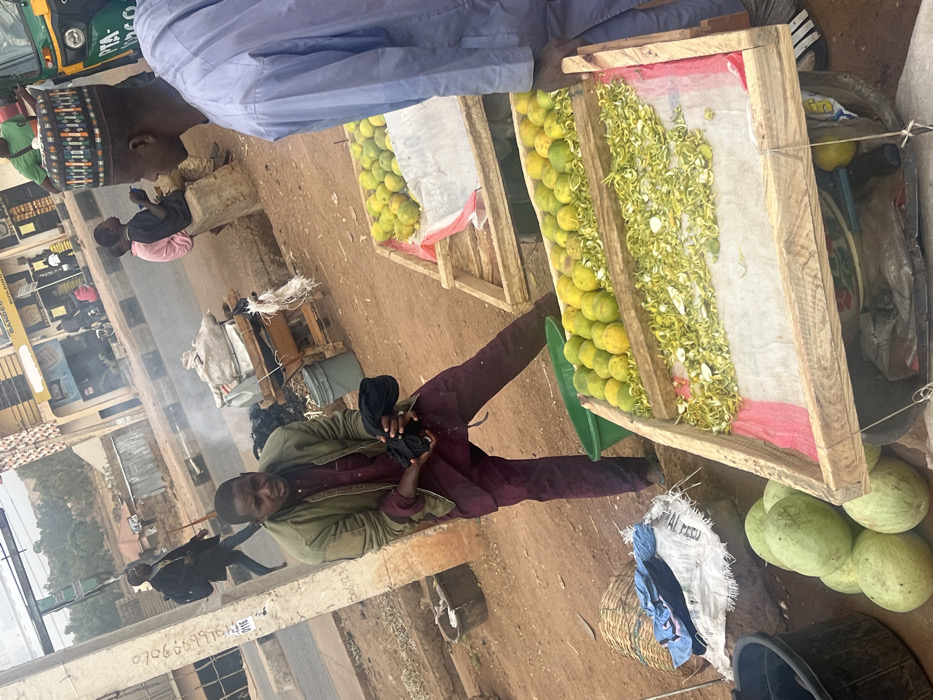 A street vendor sits near wooden crates filled with yellow fruit and lighter green petals. He holds a dark object in his hands. Watermelons are piled nearby. A child in pink sits on a concrete block in the background. There are buildings, vehicles, and other people in the distance. A sign with numbers is visible on a structure near the vendor. The scene suggests a bustling outdoor market or roadside sale.