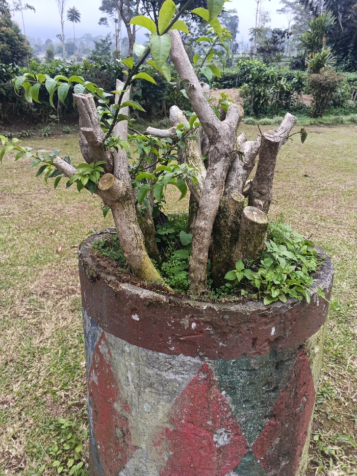 The image displays a large, cylindrical concrete planter situated on a grassy area. The planter's exterior is painted with a faded geometric pattern composed of red, grey, and possibly green diamond shapes; the paint is visibly worn and chipped. Inside the planter, several thick, gnarled, grey-brown tree stumps, approximately 10-15 cm in diameter, are visible. These stumps show evidence of recent pruning, with clean cuts at their tops and on severed branches. Bright green leaves and new shoots are actively growing from the stumps, interspersed with smaller herbaceous green plants covering the soil surface. The surrounding environment consists of a lawn with green and brownish grass. In the background, a dense arrangement of various trees and bushes forms a green horizon under a light sky. No individuals are present, nor are any specific actions or interactions depicted. There is no visual information within the image to confirm its location as Lokossa, Benin.