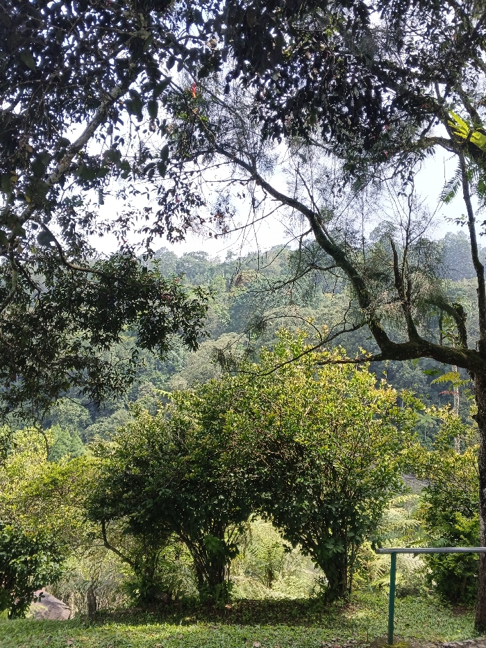 Lush greenery dominates the scene, with a dense forest sprawling across the background hills. Two bushy trees create an arch-like shape in the foreground, framing a glimpse of the forest behind. Overhead, tree branches and leaves create a partial canopy, filtering the sunlight. A green metal railing stands on the right side of the frame, marking a boundary. The overall impression is of a verdant, natural setting.