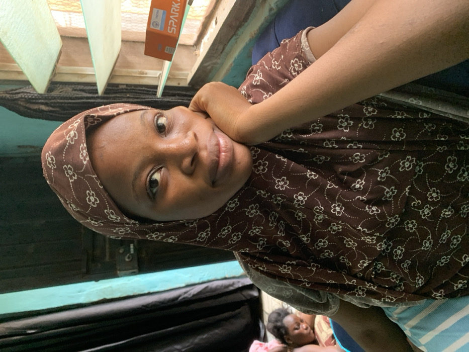 The image depicts an indoor scene in Minna, Nigeria, featuring a young adult female as the primary subject. She is dark-skinned, wearing a brown hijab patterned with white flowers and a grey short-sleeved top. Her chin rests on her left hand, and she looks directly at the camera with a slight smile. She is seated on a surface with blue and white stripes, with a dark blue surface visible to her right. In the background, to the subject's left, a young, dark-skinned child is partially visible, lying down and appearing to be asleep or resting. Behind the child are dark curtains and a light blue wall, with a dark wooden door frame or door also visible. To the subject's right, a window with several horizontal, light-colored louvers is present. An orange box, labeled "SPARK 4" with a TECNO logo, rests on one of the window ledges. Dark, braided hair or a similar fibrous object hangs near the window. The wall to the right is also light blue. The overall environment suggests a residential setting.