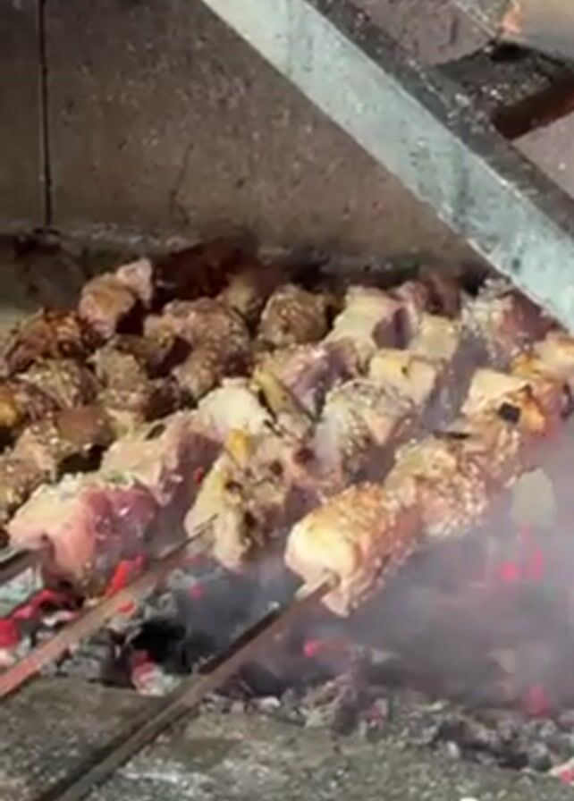 Skewers of meat are being cooked in a brick fireplace, with glowing embers providing the heat. The meat is cut into cubes and threaded onto the skewers, some of which are darker in color than others. There is a metal bar above the meat and embers. Smoke rises from the cooking meat. The interior of the fireplace is rough and textured.