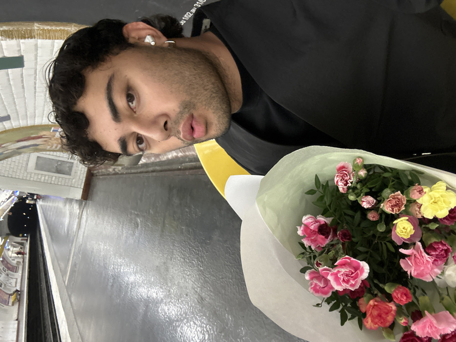 young man seated on a yellow bench on a platform within the Paris Metro system. He has dark, curly hair, light facial stubble, brown eyes, and his lips are slightly pursed. He wears a black t-shirt underneath a black sleeveless garment, a white earbud in his right ear, and a gold hoop earring in his left ear. He holds a bouquet of flowers, primarily pink, red, and yellow carnations with green foliage, wrapped in white and light green paper. In the background, a grey, wet-looking metro platform extends to train tracks that lead into a dark tunnel. The station walls are lined with white beveled tiles and patterned decorative panels, one displaying the text "01/02 au 31/02", consistent with Parisian subway architecture.