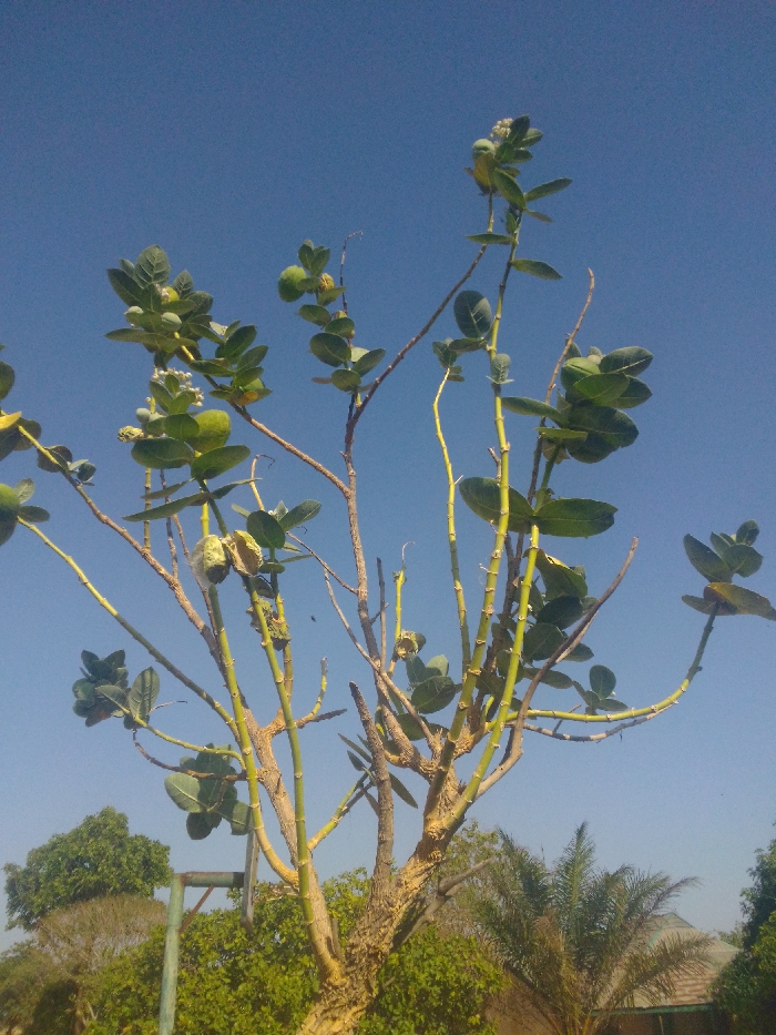 The image presents an upward view of a deciduous or semi-deciduous plant, possibly a shrub or small tree, against a clear, bright blue sky. The plant features a robust, textured main stem and older branches with yellowish-brown bark. Numerous thinner, smooth branches, predominantly lime-green to yellow, extend from the main structure. Large, ovate, dark green leaves are sparsely distributed, primarily at the ends of the green branches; some exhibit a lighter underside. Several small, pale green, spherical buds or developing fruits are present. Additionally, a few larger, greyish-green seed pods are visible, some of which are split open, exposing white, fibrous material. In the lower background, dense green foliage forms undergrowth, accompanied by a larger, darker green tree on the far left and the fronds of a palm tree on the right. A dark-colored metal frame structure is partially visible behind the central plant to the left, and a light-colored building with a sloped roof is faintly discernible through the background trees on the right. No individuals or discernible actions are present in the scene. Location: Unknown, Unknown.