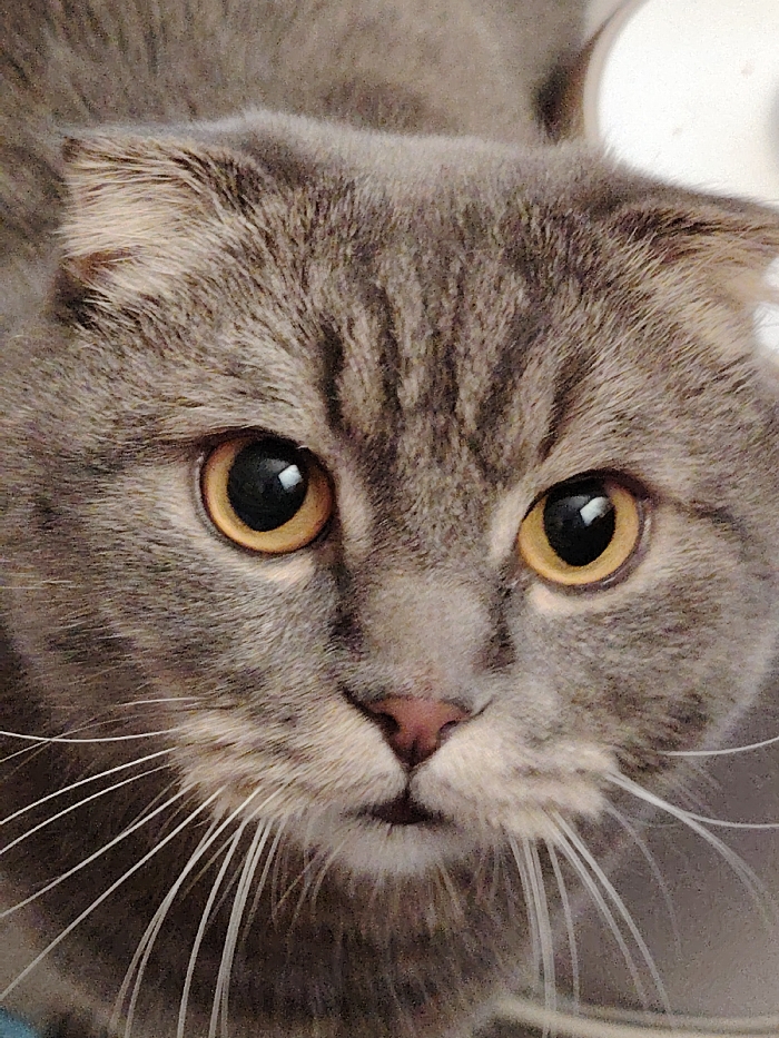 - "A close-up image depicts the head and upper torso of a domestic cat, identified as likely a Scottish Fold due to its distinctive folded ears" by FM-9xtHL2, licensed under CC BY 4.0