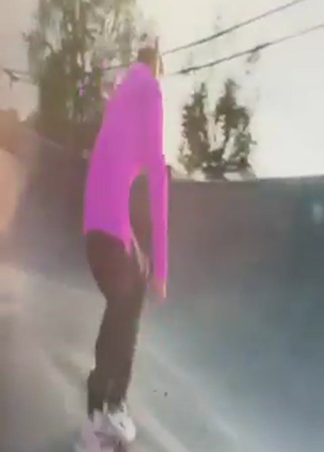 A person wearing a pink long-sleeved shirt, dark pants, white shoes, and a white hat is skateboarding in a skate park. The person starts at the bottom of a curved ramp and skates up, balancing at the top, before rolling back down. The skate park is outdoors with grass and trees in the background, as well as buildings and parked cars. The video appears to be a recording of a screen displaying a video game.