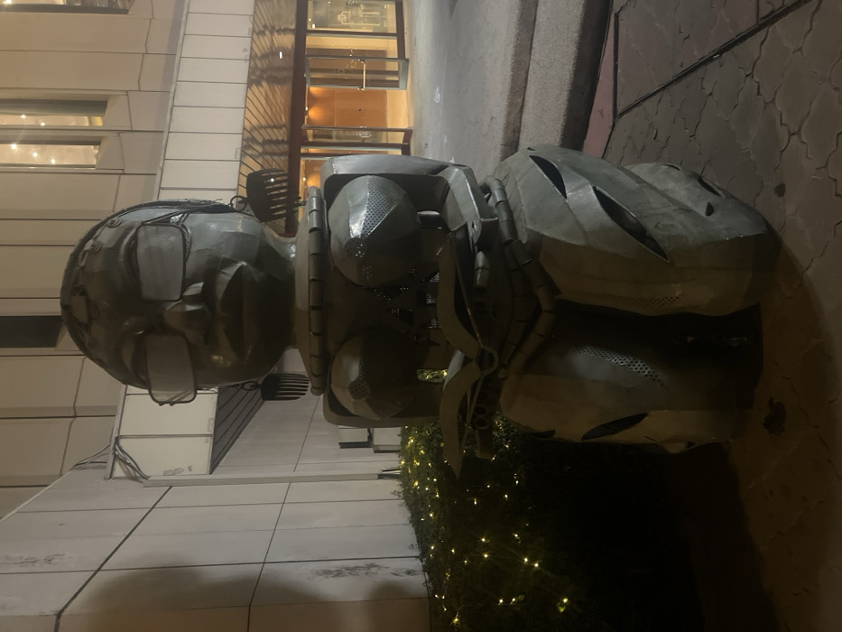 A large, metallic sculpture stands on a paved area near a building. The sculpture depicts a head with glasses and a torso composed of rounded, segmented shapes with perforations. The sculpture is partially obscured by a bush adorned with small, warm-toned lights. The building behind has multiple windows with soft interior lighting, and a glass-enclosed entryway is visible. The overall lighting suggests an evening or nighttime setting.