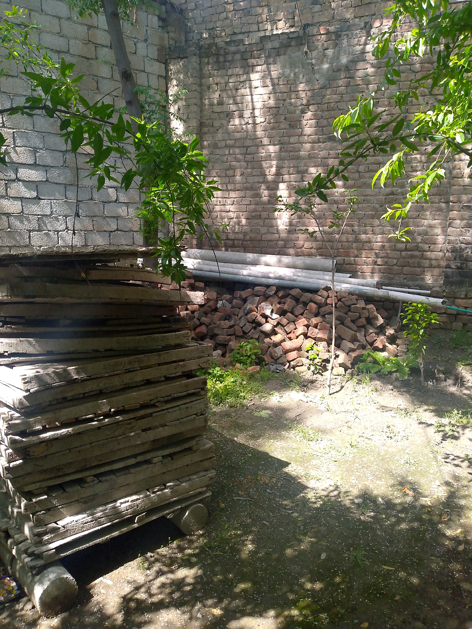 backyard or storage area, likely in an urban setting. A stack of rectangular concrete slabs rests on cylindrical concrete supports to the left. Behind the slabs are a pile of red bricks and several white pipes laid against a brick wall. A small sapling grows in front of the bricks. The ground is dirt and sparse grass, dappled with sunlight filtering through tree branches. The walls are made of brick in different colors.