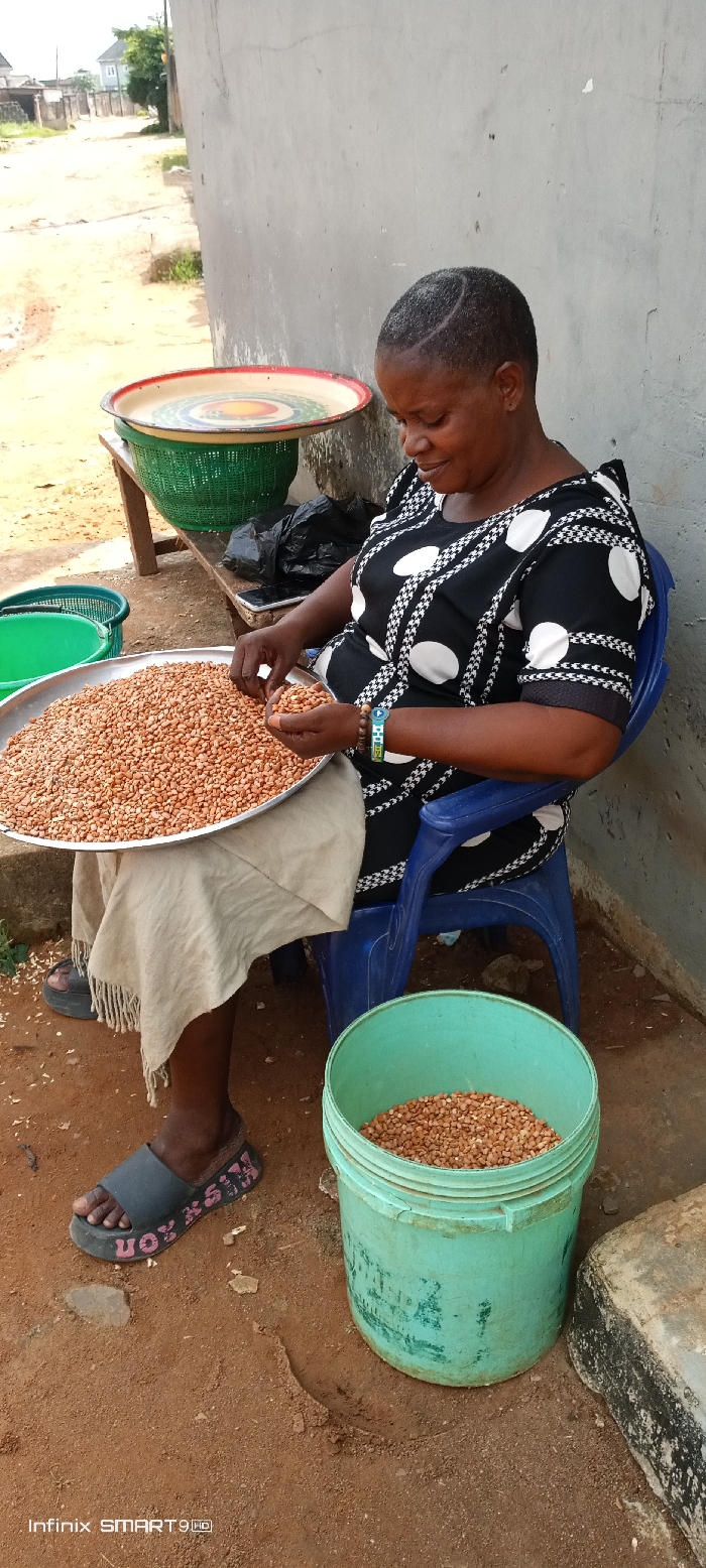 This image, taken in Agege, Nigeria, depicts an adult female engaged in manual sorting outdoors