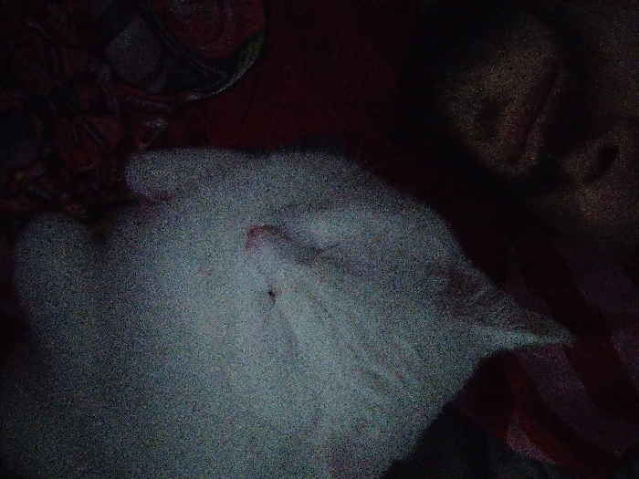 A grainy, dark image reveals a fluffy white cat resting next to a person. The cat's ear is visible on the right side of its body, and a small spot of pink can be seen near its head. The person's face is visible in the upper right corner, although it is somewhat obscured by the darkness. A patterned red and black object sits next to the cat. A striped red object can also be seen next to the person’s face.