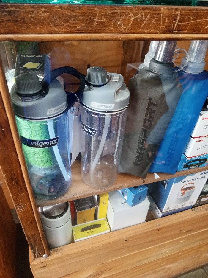 The image captures a close-up view of merchandise displayed within a two-tiered wooden shelving unit, purportedly located in Baza, Myanmar (Burma), though no explicit geographical identifiers are visible. The items are positioned behind a transparent, reflective barrier, likely glass or clear plastic. On the upper shelf, from left to right: 1. A transparent blue Nalgene water bottle, featuring a grey flip-top lid with a dark grey screw-top and a black strap. Inside, a green mesh filter or infuser is visible, along with a clear straw. The "Nalgene" brand name is prominent in white. 2. A clear transparent Nalgene water bottle, identical in design to the first, with a grey flip-top lid, dark grey screw-top, and black strap. It contains a clear straw and has a white tag attached to its strap. The "Nalgene" brand name is visible in white. 3. Two flexible, collapsible soft water bottles or pouches. The one on the left is dark grey with the word "SPORT" debossed vertically on its surface, and it has a black screw cap. The one on the right is transparent blue, also with "SPORT" debossed vertically, and a black screw cap. 4. In the upper left background, behind the Nalgene bottles, a black box with white text, including "KEYCHAIN LIGHT," is partially visible. On the lower shelf, arranged beneath the water bottles: 1. On the far left, a silver or light grey cylindrical container, possibly a thermos or insulated mug. 2. In the center, several small boxed items are visible. A prominent yellow box displaying the brand "Brica" is distinguishable. Other white and blue boxes are stacked nearby. 3. On the right, a white box with orange accents is visible, labeled "Camping Light" and featuring an illustration of a lantern. A red and white box is partially obscured above it. The wooden shelves are light brown, displaying visible scratches and wear, particularly on the horizontal surface separating the two tiers. The overall scene shows various outdoor or travel-related accessories.