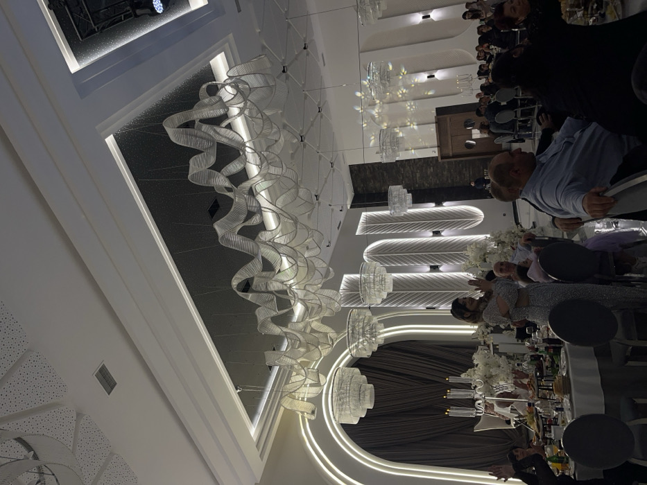 An indoor event hall in Hrazdan, Armenia, is depicted during a social gathering. In the mid-left foreground, a woman in a silver sequined two-piece outfit stands, clapping her hands. She is positioned near a round table set with a white tablecloth, dark chairs, assorted food, beverages, a white floral centerpiece, and a four-branch candelabra with white candles. Multiple individuals are seated at this table and numerous other round tables extending into the background. The expansive hall features a high white ceiling with a prominent, undulating, light-colored chandelier, supplemented by multiple tiered crystal chandeliers. Wall decorations include an arched alcove with dark brown drapes, several vertical, illuminated panels resembling stylized feathers, and a segment of dark, textured wall cladding. Lighting is provided by a combination of overhead fixtures and wall-mounted lights.
