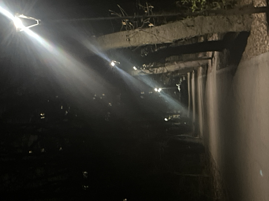 The image depicts a nighttime outdoor scene in Sofia, Bulgaria, characterized by artificial illumination. A paved pathway, likely asphalt or concrete, extends from the foreground into the distance, curving slightly to the left. To the immediate right of the path, a discernible strip of ground covered with what appears to be dry leaves or sparse vegetation is visible. A row of at least five trees with pale, possibly whitewashed or light-barked trunks, lines the right side of the pathway, casting long, distinct shadows across the path due to the lighting. Multiple streetlights with bright, white illumination are present, primarily positioned along the right side of the path and among the trees. One prominent streetlight in the upper right corner emits a strong, diagonal beam of light that cuts across the frame. The background is largely dark, with additional trees and faint, scattered light sources, potentially from distant structures, visible through the foliage on the left and in the far distance. No individuals or vehicles are present in the visible portion of the scene.