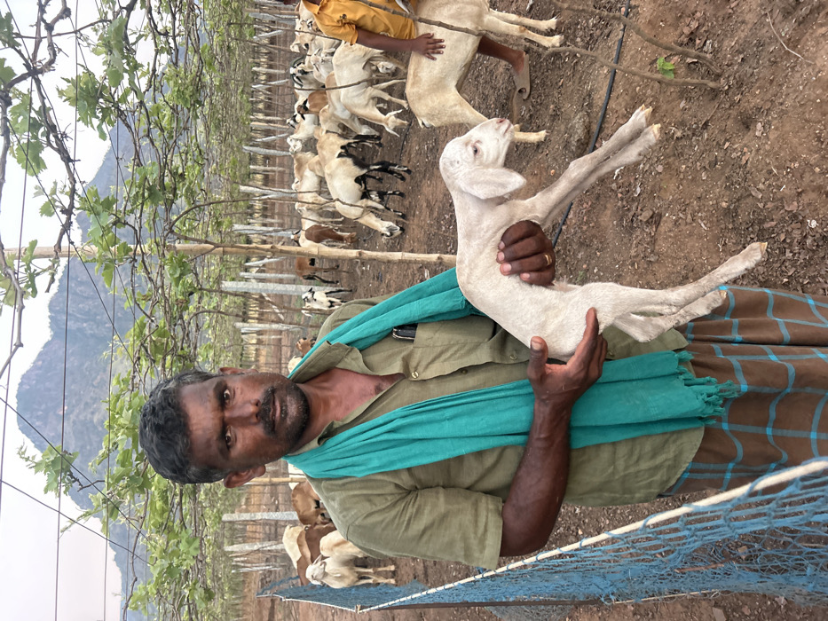 An adult male stands in an agricultural setting in Chinnalapatti, India, which combines a vineyard with livestock farming