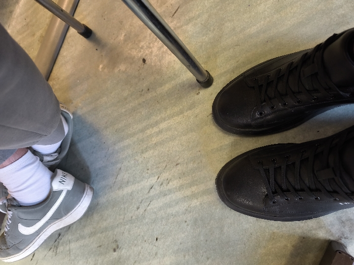 The image displays a close-up, downward view of a light-colored, possibly linoleum or tiled floor, with scuff marks and a subtle linear texture. Two distinct pairs of footwear are present. On the left, a person's lower left leg is visible, wearing light gray trousers, white ankle socks, and a gray Nike brand low-top sneaker with a white swoosh and a white sole. The word "NIKE" is visible on the sneaker's tongue. On the right, two black high-top sneakers with black laces are positioned parallel to each other. In the upper central portion of the frame, two metallic cylindrical objects, likely furniture legs, extend downward; one leg has a black rubber tip. The scene provides no discernible architectural or environmental features to identify a specific location within the city of Bogomilovo, Bulgaria. No explicit actions or interactions are visible beyond the presence of the footwear.