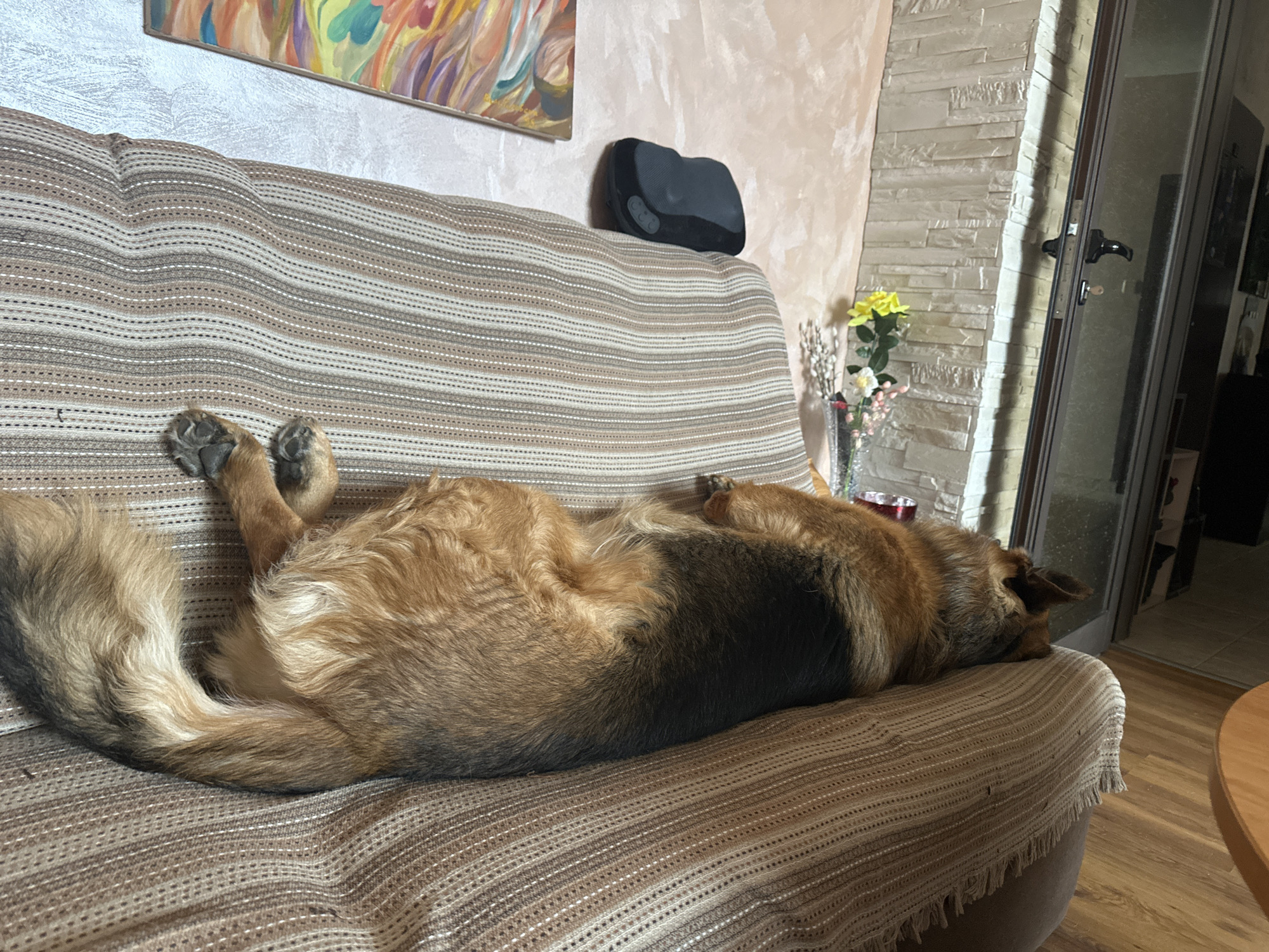 A medium-sized German Shepherd dog is sleeping on a striped beige and brown couch. The dog is lying on its back, with its tail curled up. A black object is sitting on the back of the couch, and a painting is hanging on the wall above it. A vase with flowers is on a table next to the couch, near a door. The location is likely an apartment in Sofia, Bulgaria, based on the architectural style and interior design elements.