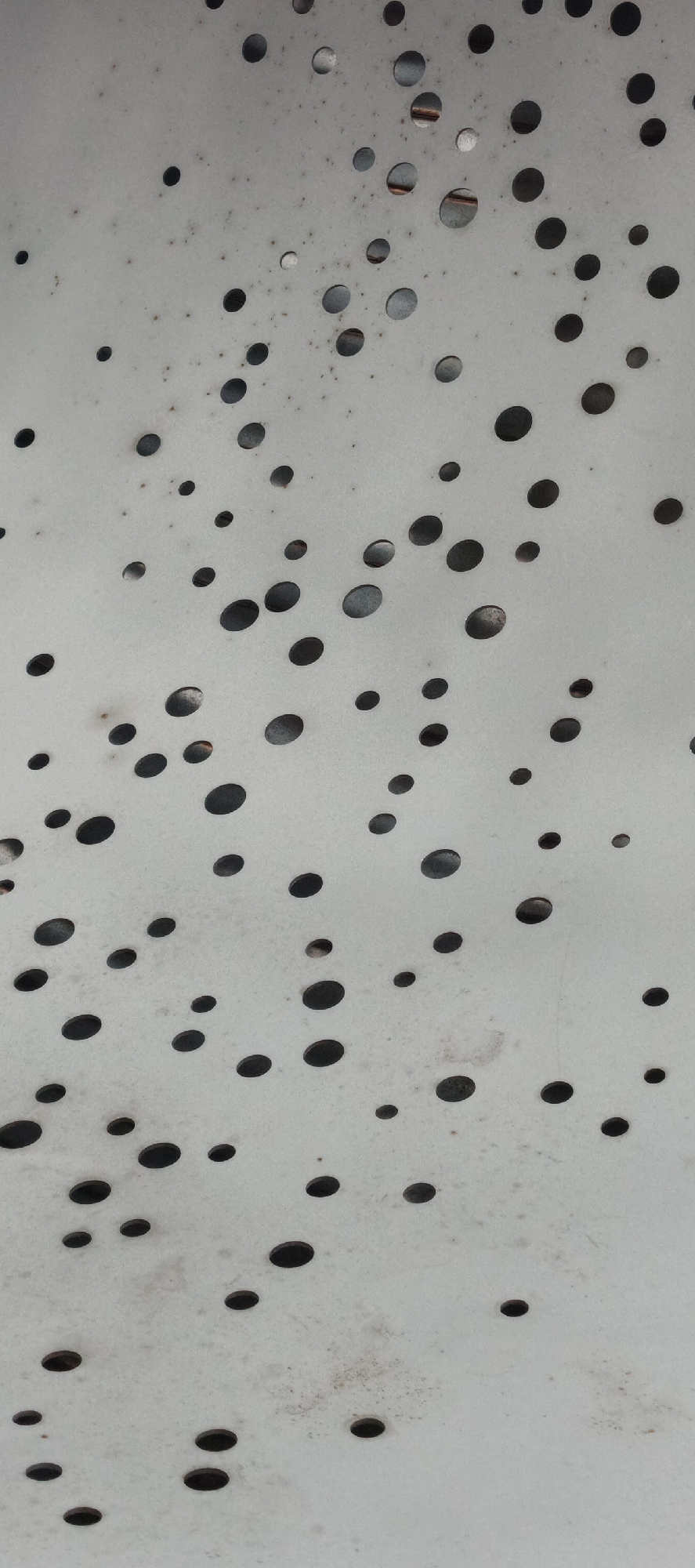 - "A close-up vertical shot depicts a light gray metal surface riddled with numerous circular holes of varying sizes" by FM-lbJQ42, licensed under CC BY 4.0