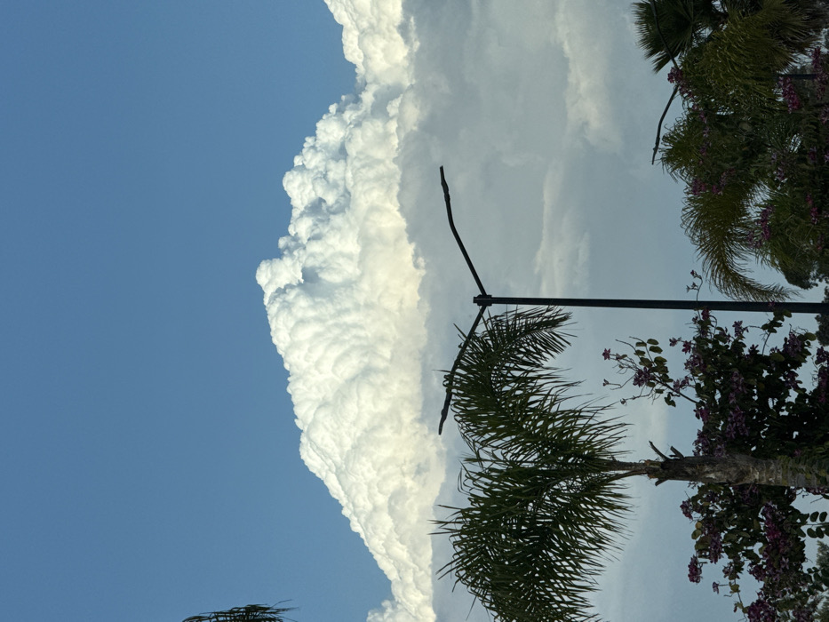 The image depicts a vibrant sky with a large, billowing white cumulus cloud on the left, contrasted against a clear blue expanse. A palm tree with lush green fronds partially obscures the view. A black metal pole bisects the scene. Flowering bushes with delicate purple blooms add a splash of color on the right. The picture is oriented sideways, creating an unusual perspective.