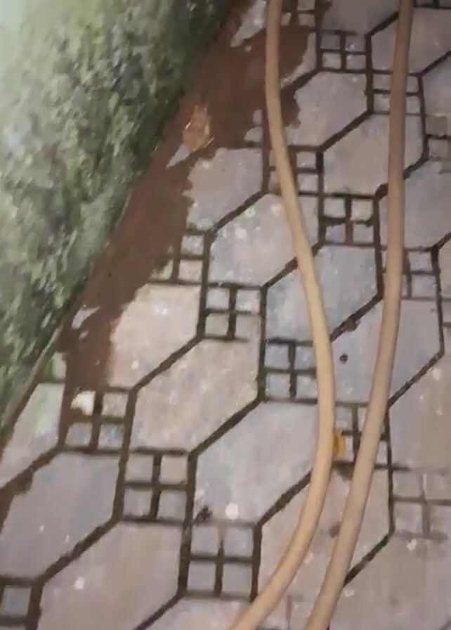 frog sitting on a damp concrete patio. The patio is made of square tiles with a geometric pattern. A beige garden hose runs along the tiles. A mossy wall is visible in the background. The lighting is dim.
