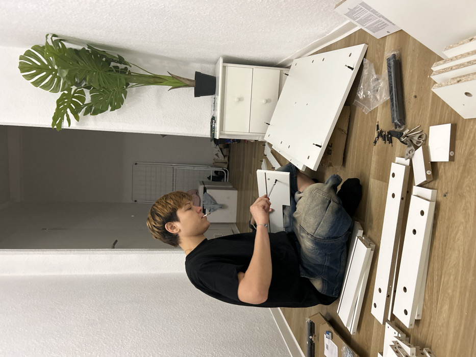 n interior scene, specifically a room within a building in Dresden, Germany. A single individual, appearing to be a young adult male with short hair and lighter ends, is seated cross-legged on a light brown wooden floor. He is wearing a black t-shirt, faded blue baggy jeans, and dark socks. A cigarette is held in his mouth. He is actively engaged in assembling white flat-pack furniture, holding a Phillips head screwdriver in his right hand and manipulating a white furniture panel. A thin, light-colored bracelet is on his left wrist. Numerous unassembled white particle board furniture components, including panels and smaller pieces, are scattered across the floor around him. Some pieces have pre-drilled holes and hardware (such as cam locks or dowels) inserted. A clear plastic bag containing additional hardware (screws, cam locks) and a set of keys are also visible on the floor. To the right, against a white textured wall, stands a white two-drawer nightstand with circular white knobs. On its top surface, a black potted artificial Monstera plant is positioned next to a small, dark electronic device, possibly a remote control. Through an open doorway in the background, a darker adjacent room is visible, containing a white clothes drying rack, a white storage unit, and what appears to be folded laundry. The walls of the primary room are white and textured.