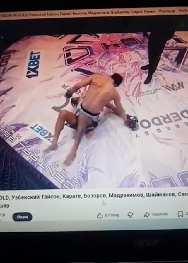 laptop screen displaying a YouTube video of a mixed martial arts (MMA) fight. Two shirtless fighters wearing gloves and shorts are grappling on the mat, which is patterned with logos and advertisements, including "1XBET" and "UNDERDOG POWERED BY." An official in black pants and shoes stands nearby. The title of the YouTube video reads "OCTAGON 84: GOLD, Узбекский Тайсон, Karate, Бозоров, Мадрахимов, Шайманов, Саидов, Рузиев - Жаугашар," indicating it is an MMA event with specific fighters. The video is being viewed on YouTube and has 67,000 likes. The YouTube channel is called "OCTAGON TV."