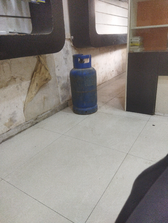This image depicts an indoor scene within the city of Nuseirat, Palestinian Territory. The foreground is dominated by a light-colored, possibly off-white, tiled floor with dark grout lines. In the bottom right corner, a dark, blurred object, possibly fabric or part of furniture, extends into the frame and casts a shadow on the floor. A blue, cylindrical gas cylinder, showing signs of dirt and wear, stands upright on the tiled floor, positioned slightly left of the image center. It features a visible handle collar at its top. Behind the gas cylinder, a narrow passageway or corridor recedes into the background. The wall to the left of the cylinder is light-colored but heavily stained and discolored, with a piece of light-brown, triangular material peeling downwards from its surface. Above this wall, in the upper left, two dark, L-shaped structural elements are partially visible. To the right, a dark, vertical structure, resembling a shelving unit or a partition, marks the entrance to the passageway. Within an open section of this dark structure, a stack of light-colored items, possibly papers or books, is visible. The walls within the background passageway also appear light-colored and discolored. No individuals are present in the scene, and no specific actions are being performed.