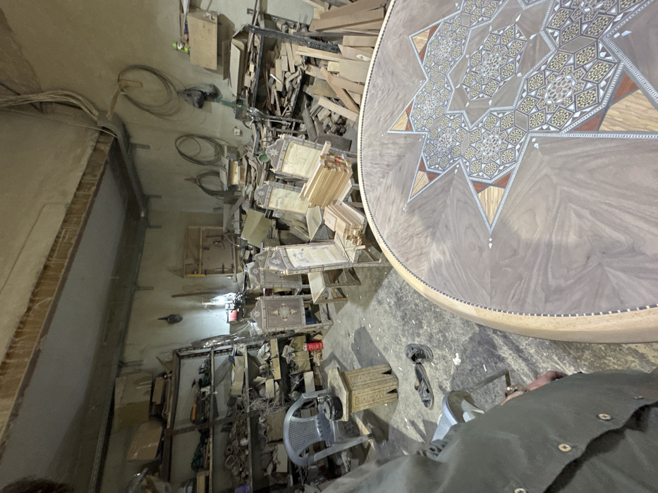 workshop in Sbeneh, Syria (latitude: 33.447, longitude: 36.278). The workshop is cluttered with wooden objects, tools, and furniture. There are several chairs stacked against a wall, and a large, intricate inlaid table in the foreground. A person's hand and part of their arm are visible in the lower left corner of the image, with a pair of sandals on the floor in front of them. The workshop is dimly lit, and the walls are whitewashed. The floor is concrete and covered in sawdust.