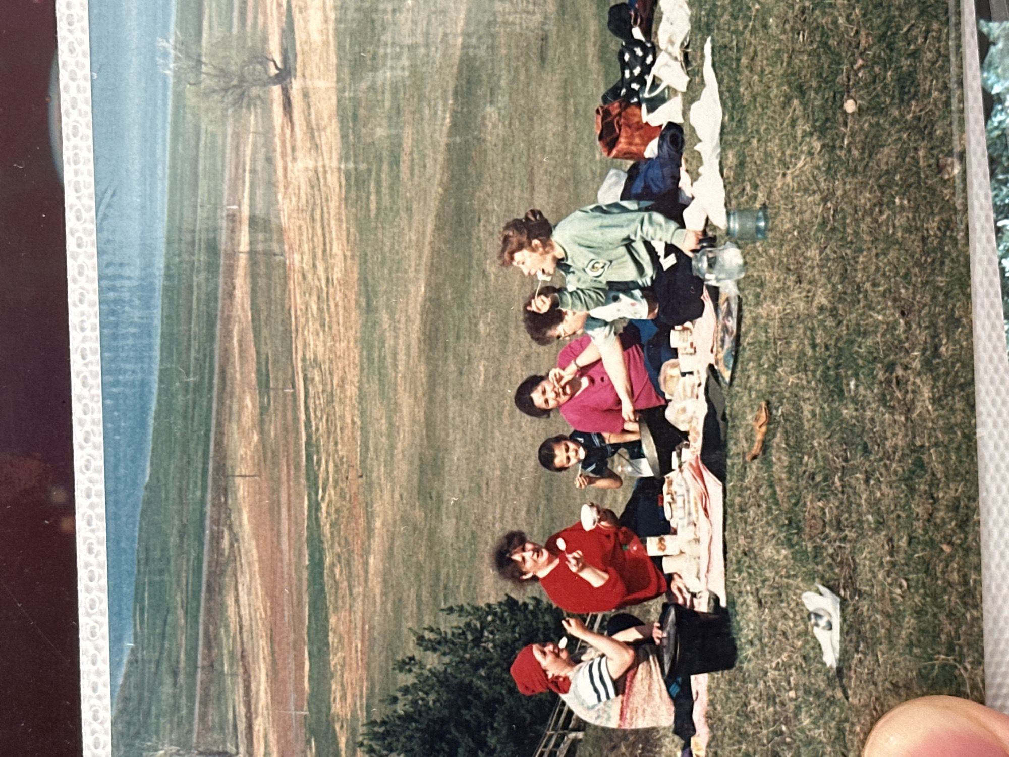 A medium shot photograph displays a group of approximately six individuals on a picnic blanket in a grassy field