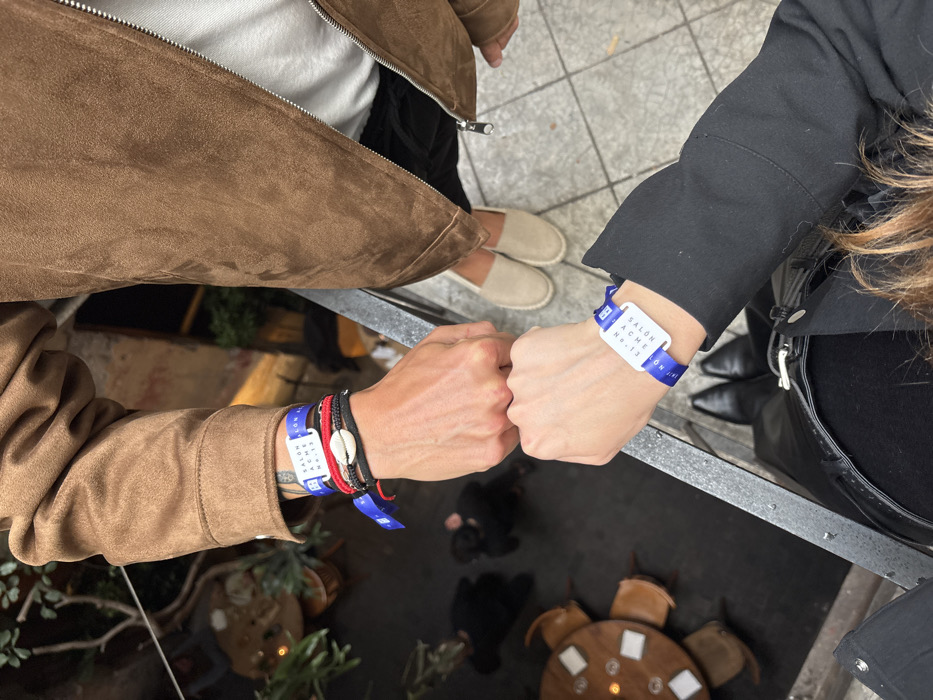 Two people in brown and black jackets perform a fist bump. Both wear blue wristbands with white rectangular tags reading "SALON ACME No. 13." The left wrist also has multiple bracelets. The lower body reveals beige shoes and black leather shoes. The scene occurs outdoors, possibly a balcony overlooking a table with decorative items. The ground appears tiled, and there's a silver metal rail separating the two individuals from the scene below.