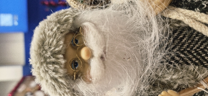 A plush, elderly-looking figure with a large white beard and gold-rimmed glasses dominates the image. The figure wears a fur-lined hood and a patterned coat, partly obscured by wispy white hair. A thick rope crosses the top of the frame. The background shows hints of blue and grey, suggesting a blurred environment. The image is oriented sideways.