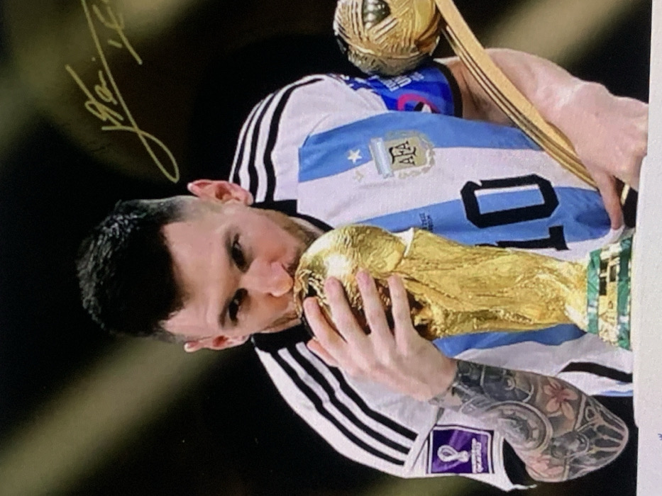 An image depicts a male individual, identified as Lionel Messi, in a celebratory pose