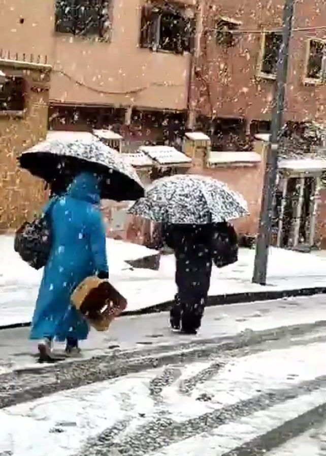snowy street scene with two people walking under umbrellas. Snow is falling heavily. The person on the left is wearing a blue robe and carrying a patterned tote bag on their shoulder and a tan box in their other hand. The person on the right is wearing a black robe. Both are walking away from the camera and across a street covered in snow, leaving tire tracks in the snow. Buildings line the street, and snow is accumulating on their roofs and ledges. A car is parked along the street in the distance. A utility pole is visible.