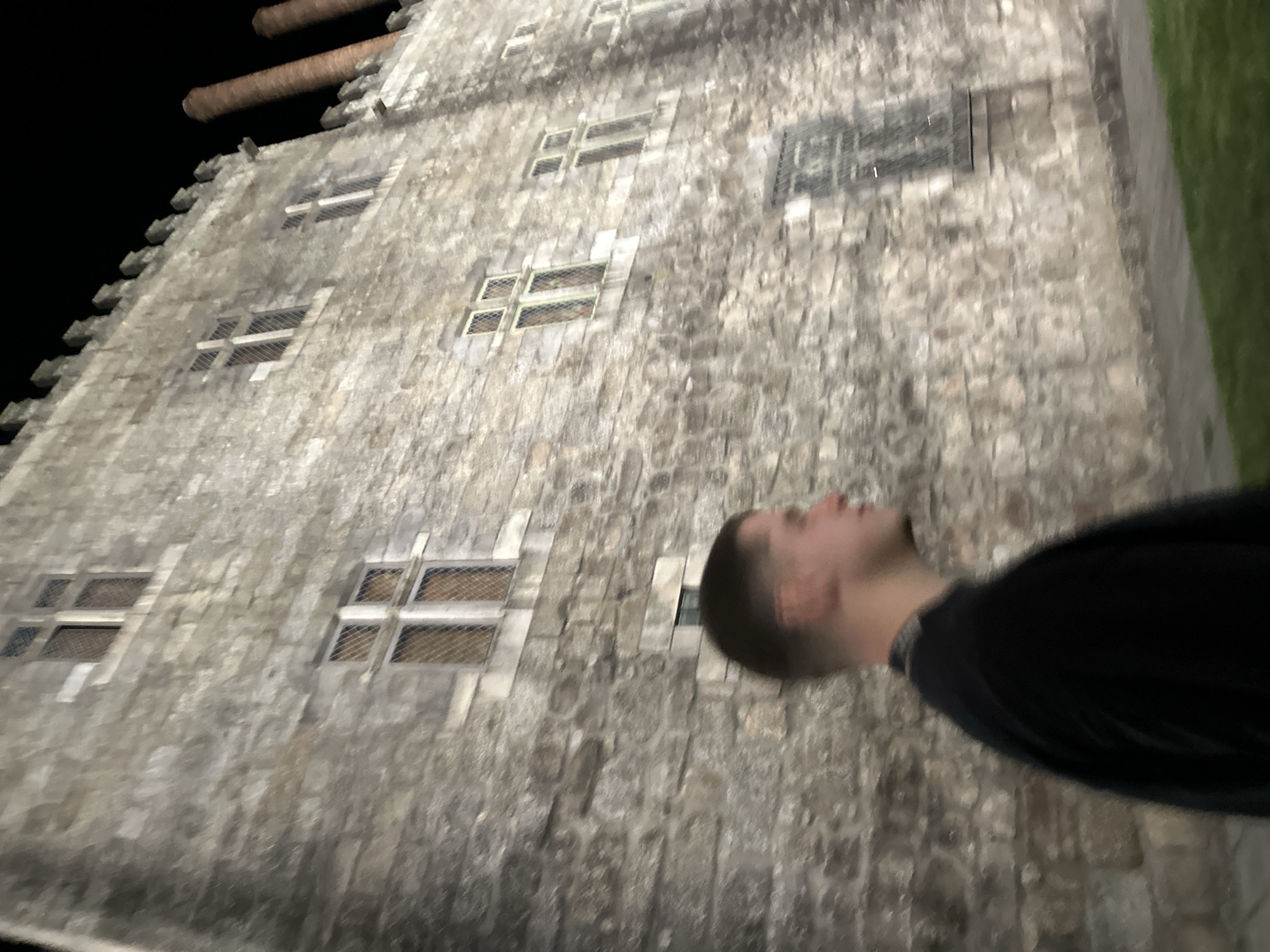 An outdoor, nighttime photograph depicts the side of the Palace of the Dukes of Braganza (Paço dos Duques de Bragança) in Guimarães, Portugal. The building features a facade of light grey, rough-hewn stone blocks, illuminated externally. Multiple rectangular windows, each with stone mullions and transoms forming a cross pattern, are visible across the wall. Several windows include metal grates or bars externally. The roofline is crenellated, and two tall, cylindrical, reddish-brown brick chimneys rise prominently on the upper right side against a dark night sky. In the foreground, on the left, a male individual is captured in profile, facing right. He possesses short, dark hair and wears a dark, long-sleeved garment with a distinct patterned collar or neckline visible. The individual's features are slightly blurred, indicative of motion or shallow depth of field. A narrow strip of green grass and a paved surface are visible at the base of the building on the lower right.