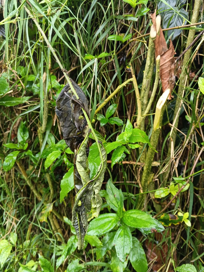 The scene depicts a dense, wet vegetated area in Inawi, Papua New Guinea. The environment is dominated by various green plant species, including broad-leafed plants and thin, grass-like foliage, all appearing moist. In the central and left portions, several leaves are shriveled, dark brown to black, indicating decay. To the right, multiple light green, woody stems exhibit fresh, light-colored cuts, consistent with recent pruning or breakage. A single, dark-bodied insect, consistent with a beetle or bug, is present on a dark, shriveled leaf in the upper left quadrant. Dry, brown plant stalks are interspersed among the green growth. No human subjects or manufactured objects are visible, only the natural and altered plant life.