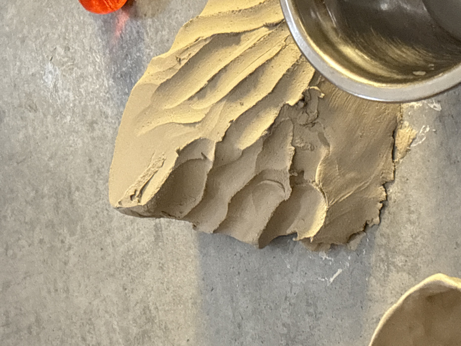 A lump of beige clay, bearing parallel striations, dominates the image. It is textured with undulating ridges, suggesting a process of manipulation. To its right, a metal bowl's edge is visible. In the upper left, an orange sphere partially enters the frame. The clay rests on a mottled gray surface, possibly concrete or stone, with some scattered white residue visible. The lighting is even, casting subtle shadows that accentuate the clay's texture.